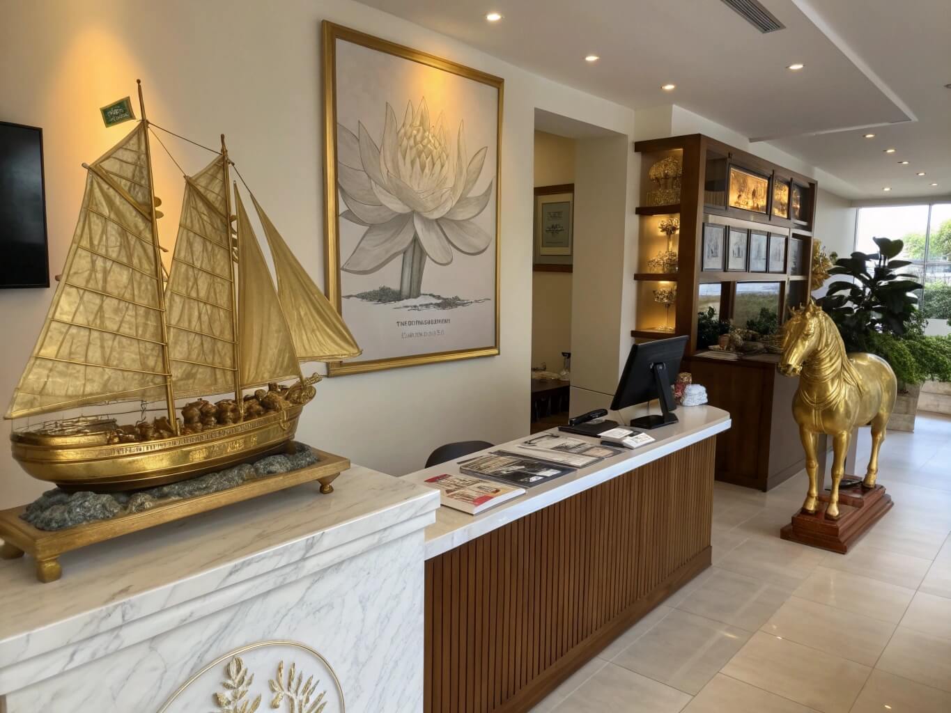 Tượng ngựa mạ vàng đặc biệt phù hợp với văn phòng booking, tượng trưng cho sức mạnh và tốc độ trong kinh doanh. Trong khi đó, tranh thuyền buồm mạ vàng tượng trưng cho hành trình suôn sẻ, lý tưởng để đặt tại lối vào nhà mẫu – nơi khách hàng bắt đầu “hành trình” khám phá không gian sống mới.