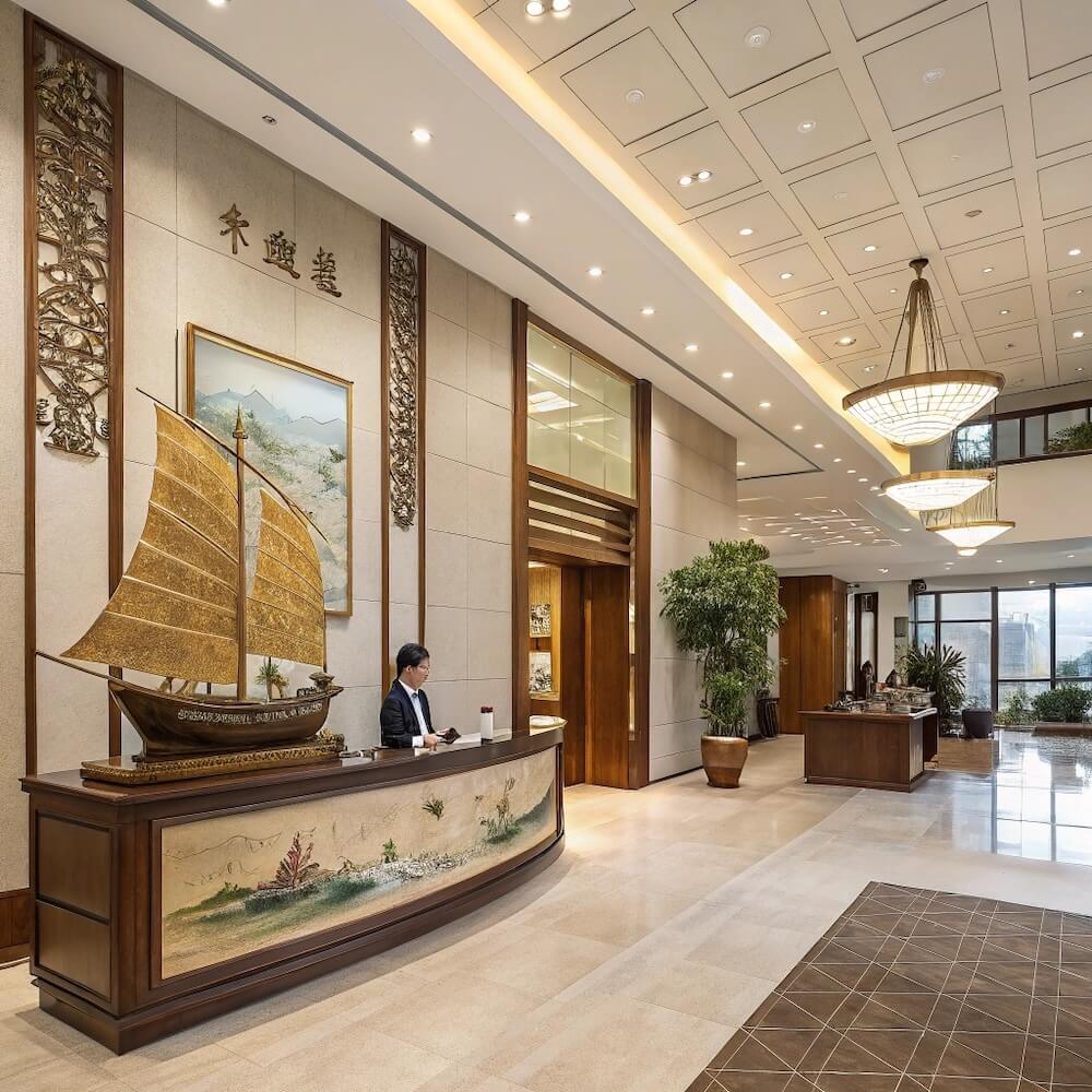 Cửa chính lệch tâm là một trong những kiêng kỵ phong thủy lớn. Cầu thang không nên đối diện trực tiếp với cổng chính. Quầy lễ tân cần đặt ở vị trí dễ tiếp cận nhưng không cản trở luân chuyển năng lượng.